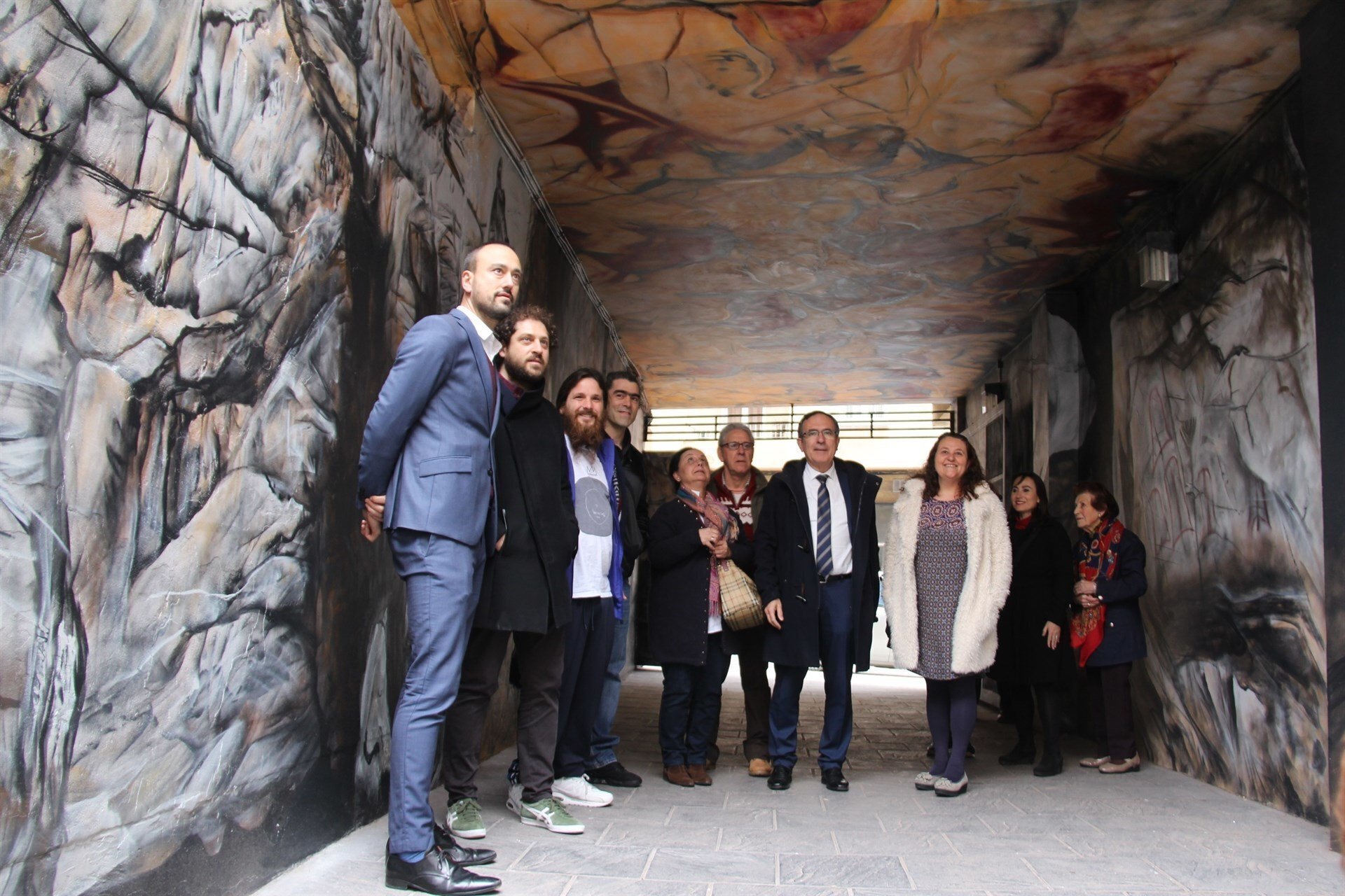 La entrada a la plaza Chanete, en el barrio de La Inmobiliaria, se ha convertido en una 'cueva rupestre del paleolítico' gracias a las pinturas en el techo de la cueva de Altamira y en los laterales de la vueva del Castillo (Puente Viesgo) y de Hornos de la Peña (San Felices de Buelna), declaradas Patrimonio de la Humanidad. Una decoración que ha realizado el colectivo de grafitti 'Actos reus', que lleva semanas trabajando para dar una nueva imagen a la entrada a esta plaza, como demandaba la Asociación de Vecinos de la Inmobiliaria. El alcalde de Torrelavega, José Manuel Cruz Viadero, y el concejal de Obras, Javier López Estrada, han acudido hoy a la inauguración de esta obra de arte urbano que ha costado cerca de 4.000 euros y que busca potenciar el uso ciudadano esta plaza. El alcalde ha explicado que fueron los propios vecinos de La Inmobiliaria los que solicitaron al Ayuntamiento mejorar la entrada de plaza y "darle más vida". Para ello, se ha llevado a cabo esta actuación, denominada 'Sonando el alma de la cueva', basada en el arte paleolítico y con un "magnífico trabajo" de 'Actus reus'. Por su parte, López Estrada ha destacado el "doble valor" de la actuación, ya que dinamiza esta plaza al tiempo que difunde "el maravilloso patrimonio rupestre que hay en Cantabria". El concejal ha agradecido la presencia de los vecinos de La Inmobiliaria, representados en su presidente, Gonzalo Llamosas, del coordinador de cuevas de la consejería de Turismo del Gobierno de Cantabria, Daniel Garrido; y de los trabajadores de Altamira.