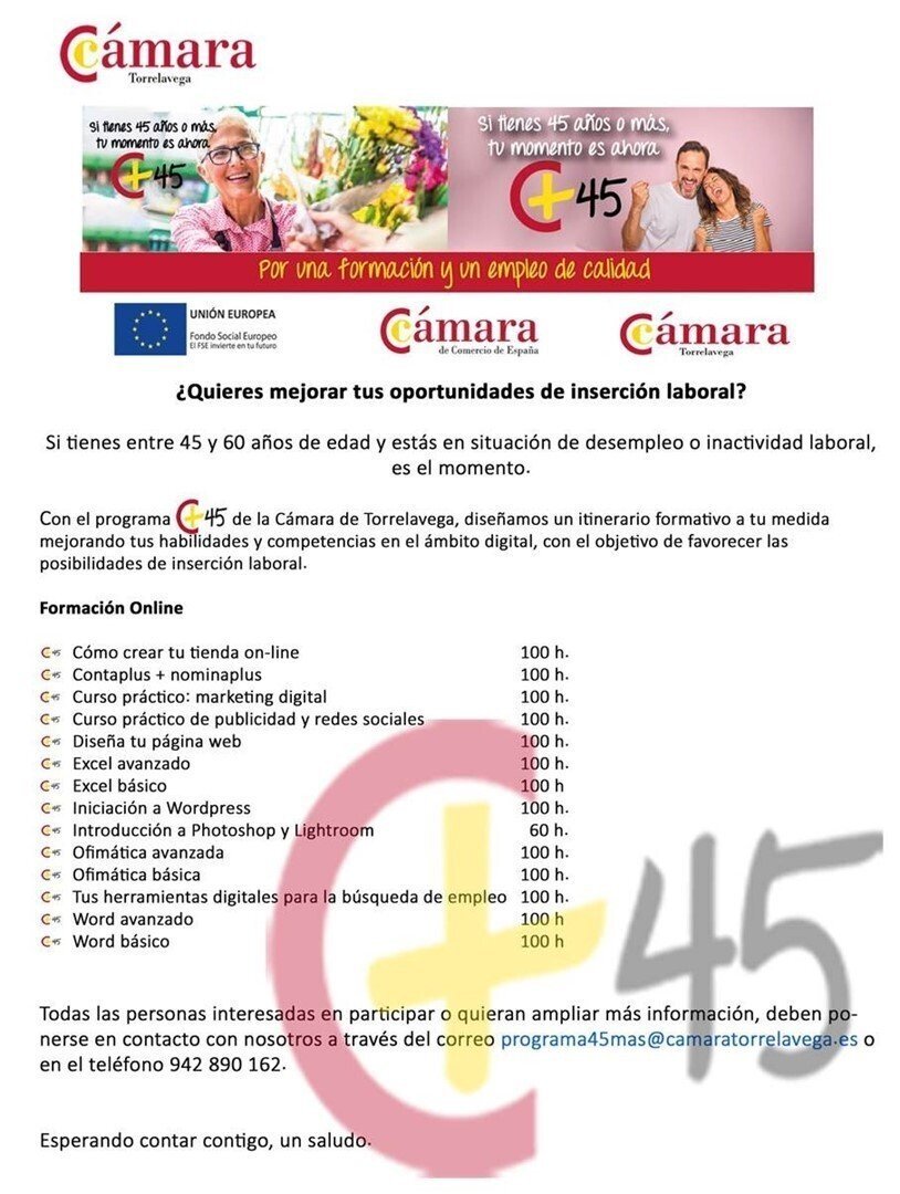 La Cámara de Comercio de Torrelavega ha lanzado el 'Programa 45+' con el objetivo de ayudar a las personas de entre 45 y 60 años que han quedado en situación de desempleo a causa de la pandemia del coronavirus.