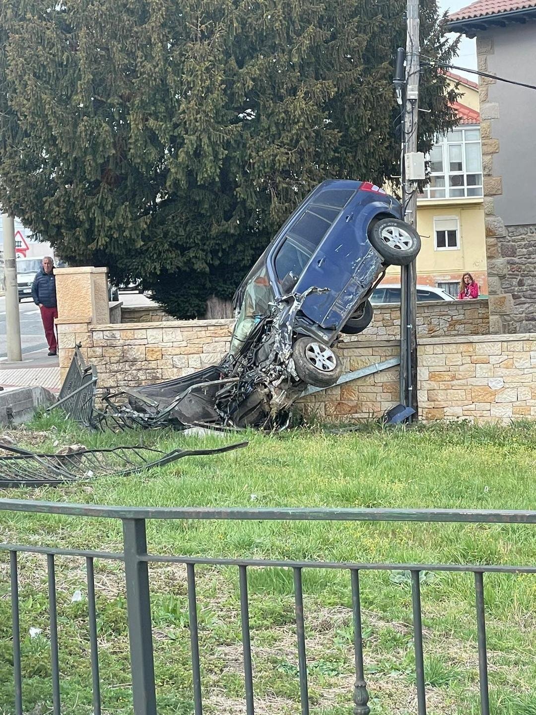 Una espectacular salida de vía en Matamorosa deja un vehículo sobre dos ruedas entre un muro y un poste