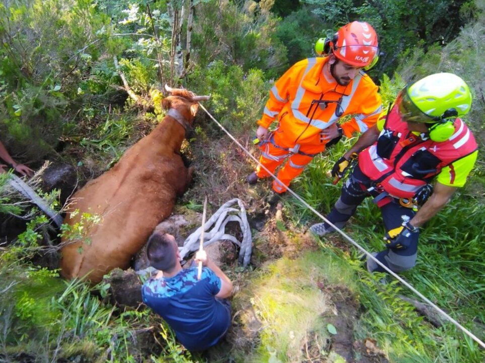 La vaca fue trasladada en vuelo hasta una pista situada en la parte superior al agujero donde había quedado atrapada. Según ha informado el Ejecutivo cántabro, el animal se encuentra en buen estado gracias a la rápida intervención.