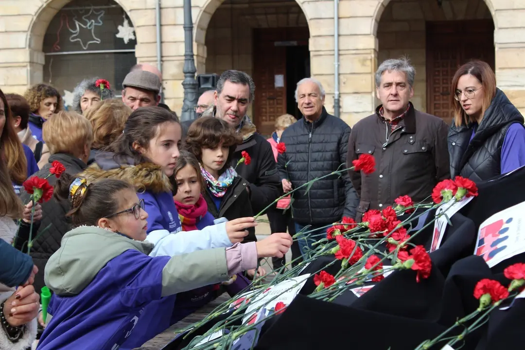 Cien claveles han recordado esta mañana a las víctimas de la violencia de género en un homenaje organizado por el Ayuntamiento de Reinosa en la Plaza de España, al que han acudido miembros de la Corporación municipal, asociaciones y vecinos.