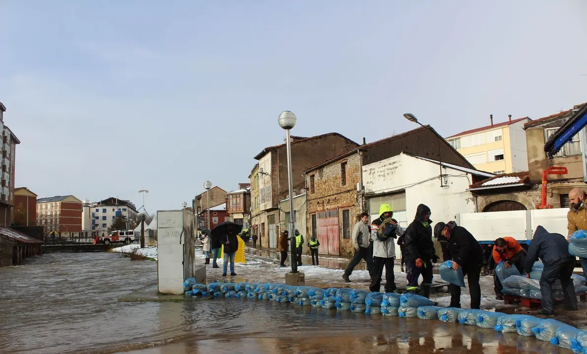 El Ayuntamiento de Reinosa está colocando sacas de arena en la ribera del río Ebro, para intentar evitar su desbordamiento en el entorno del Campo Colorado.
