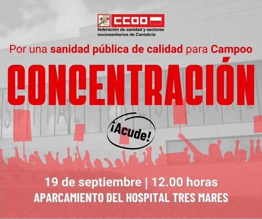 La Federación de Sanidad y Sectores Sociosanitarios de Comisiones Obreras (CCOO) ha convocado una concentración el próximo jueves, 19 de septiembre, a las 12.00 horas, en el aparcamiento del Hospital Tres Mares de Reinosa para reivindicar una sanidad pública de calidad en la comarca de Campoo.