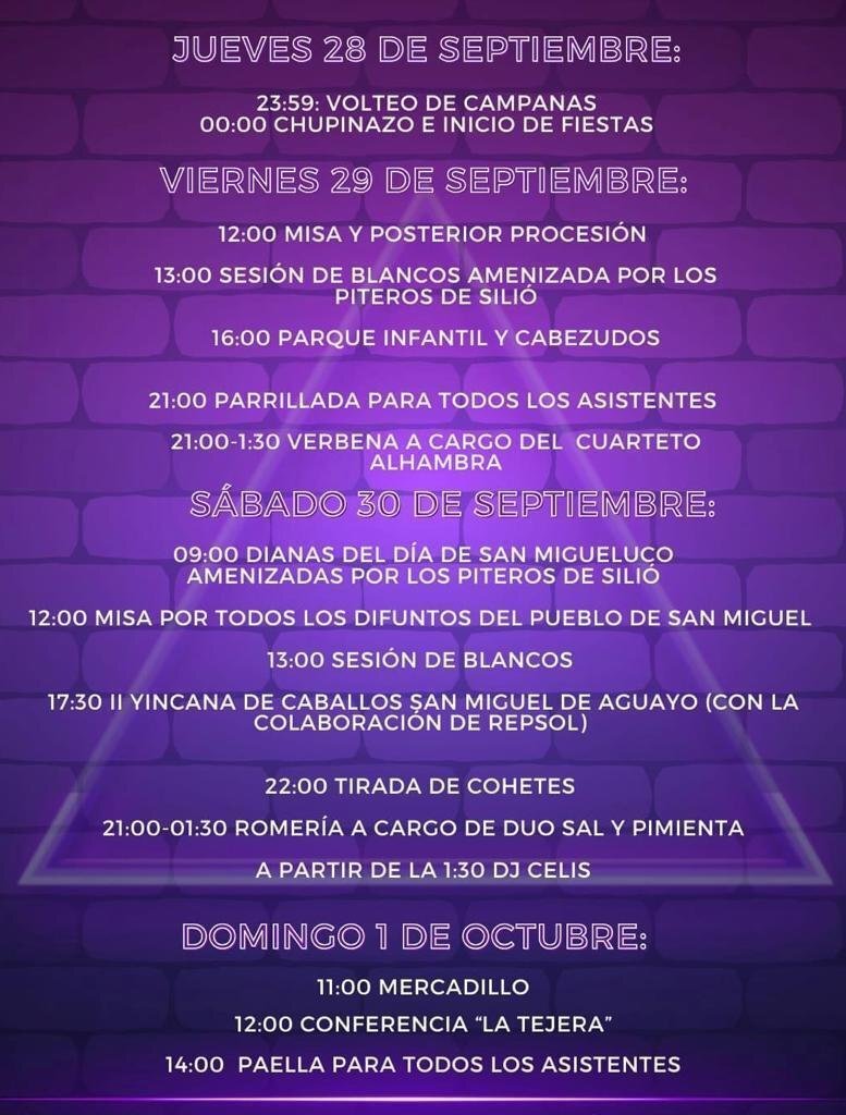 Tres días de fiesta han programado el Ayuntamiento y el concejo abierto de San Miguel de Aguayo. La programación se estrena la noche del jueves al viernes, a las 23.59 horas, con el volteo de campanas, y a media noche, el chupinazo e inicio de fiestas.