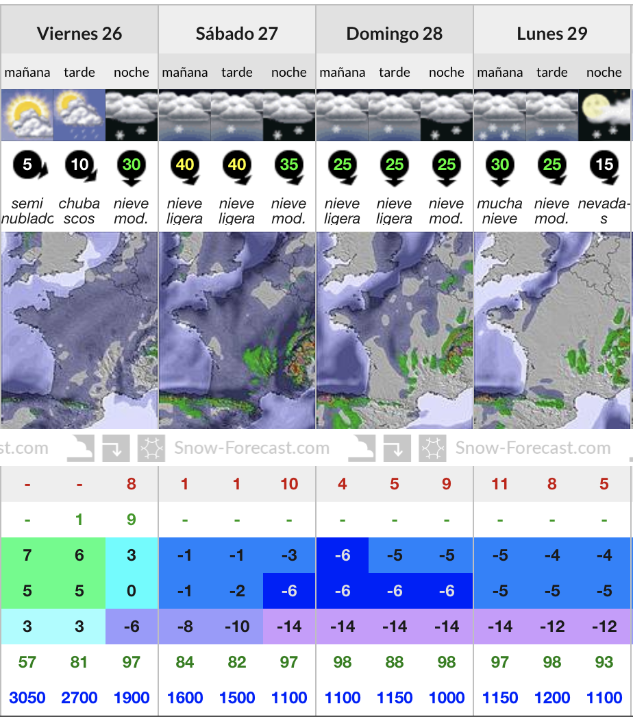 Los partes meteorológicos de la Agencia Estatal de Meteorología para el próximo fin de semana son altamente optimistas para los amantes de la nieve, también los especializados para las estaciones de esquí, como SnowForecast.