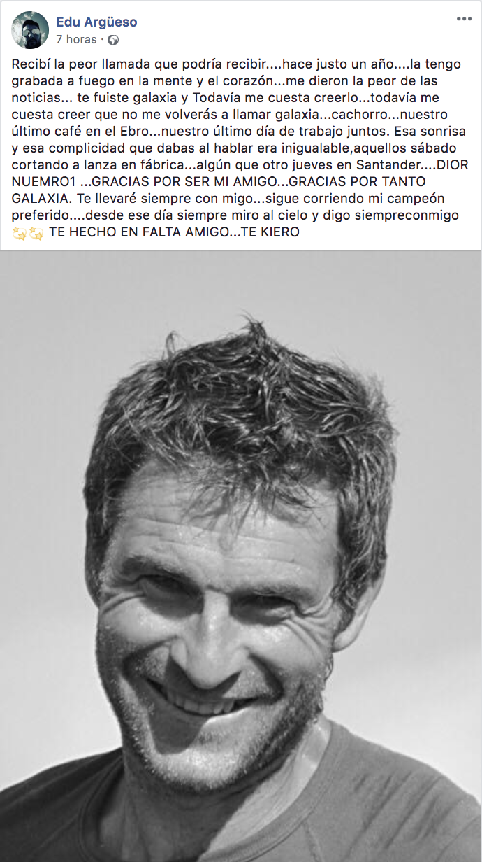 O el de Edu Argüeso: Recibí la peor llamada que podría recibir....hace justo un año....la tengo grabada a fuego en la mente y el corazón...me dieron la peor de las noticias... te fuiste galaxia y Todavía me cuesta creerlo...todavía me cuesta creer que no me volverás a llamar galaxia...cachorro...nuestro último café en el Ebro...nuestro último día de trabajo juntos. Esa sonrisa y esa complicidad que dabas al hablar era inigualable,aquellos sábado cortando a lanza en fábrica...algún que otro jueves en Santander....DIOR NUEMRO1 ...GRACIAS POR SER MI AMIGO...GRACIAS POR TANTO GALAXIA. Te llevaré siempre con migo...sigue corriendo mi campeón preferido....desde ese día siempre miro al cielo y digo siempre conmigo TE HECHO EN FALTA AMIGO...TE KIERO