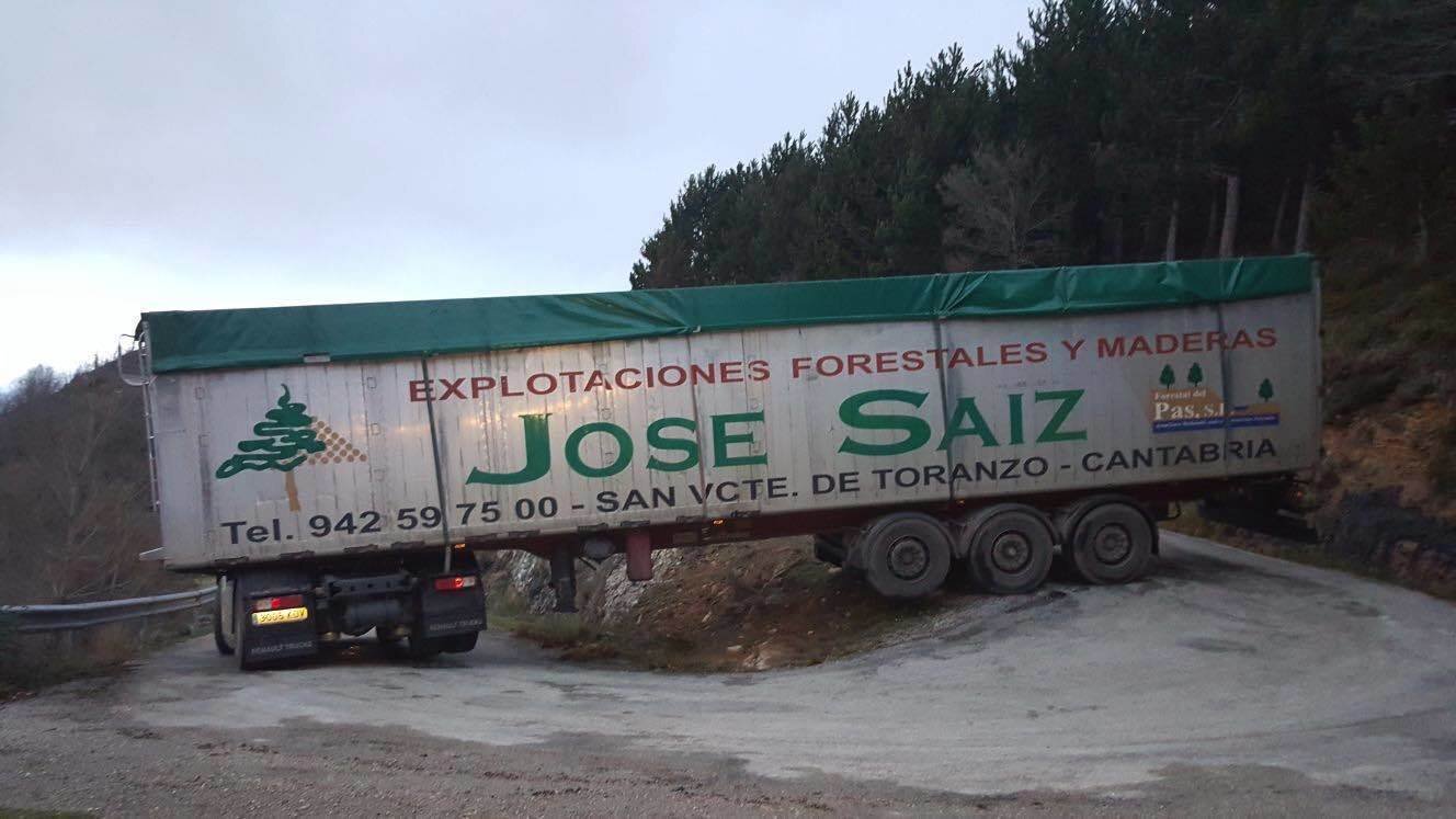 A las 17:00h se quedada literalmente 'colgado' este camión articulado en la carretera que une Espinosa de Bricia y Santa María de Hito en Valderredible.