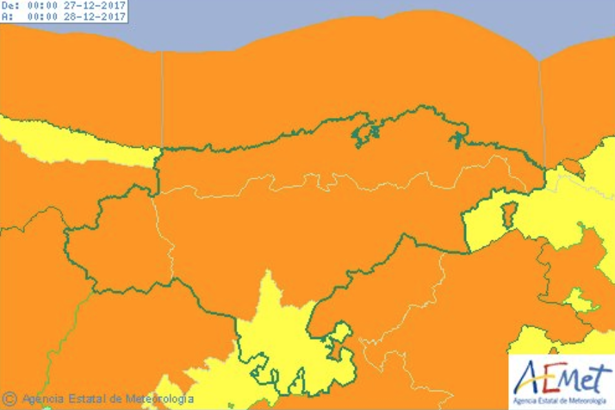 También el litoral estará durante todo el día en riesgo por fuerte oleaje, que hará que en casi toda la jornada, hasta las 21.00 horas, esté activo el aviso naranja, con previsión del viento del suroeste rolando al noroeste de fuerza 7 a 9 y mar combinada del noroeste de 7 a 8 metros.