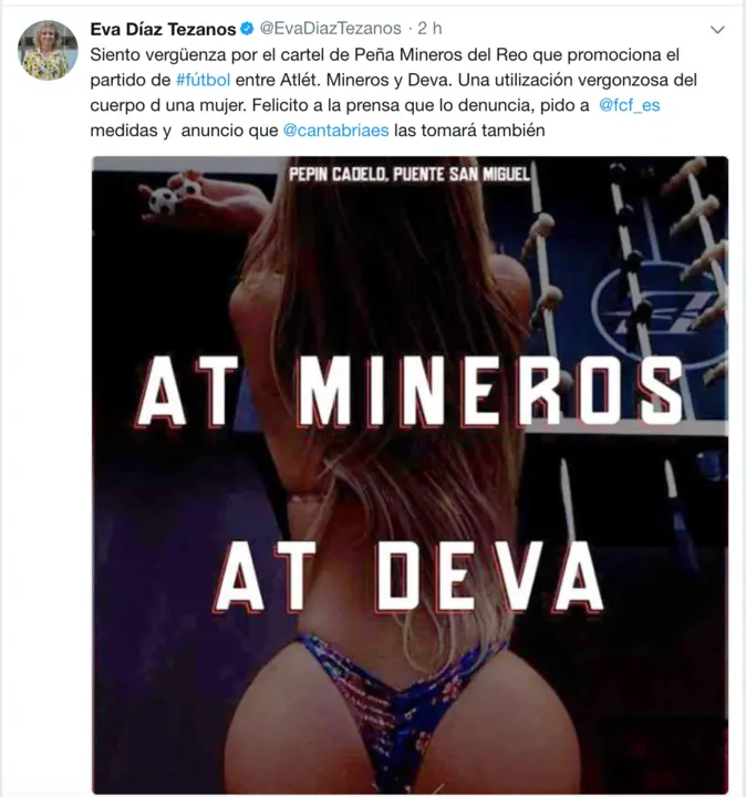 A través de su cuenta de Twitter declaraba hace unos minutos: "Siento vergüenza por el cartel de Peña Mineros del Reo que promociona el partido de #fútbol entre Atlét. Mineros y Deva. Una utilización vergonzosa del cuerpo d una mujer. Felicito a la prensa que lo denuncia, pido a  @fcf_es medidas y  anuncio que @cantabriaes las tomará también"