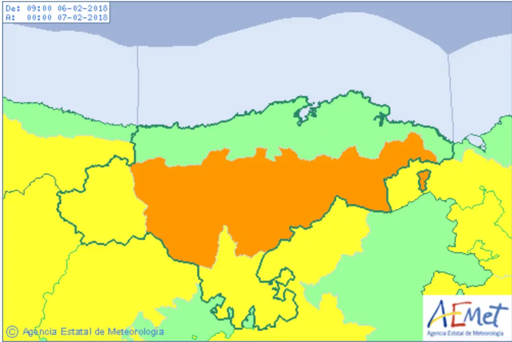 Aviso naranja por nieve. La Agencia Estatal de Meteorología (AEMET) mantendrá activo durante hoy y mañana el aviso naranja por nieve en el centro de Cantabria y el valle de Villaverde. La previsión para esta área es que se produzcan acumulaciones por encima de 300-500 metros, que serán mayores en zonas de montaña. Cota entre 100 y 300 metros, aunque temporalmente puede nevar a cualquier cota. Se acumularán más de 4 centímetros por encima de 500-600 metros.