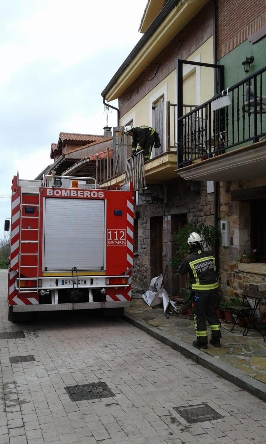 Uno de ellos se ha registrado en la localidad de Seña (Limpias), donde Bomberos del 112, con base en Laredo, han retirado la barandilla de una balconada que presentaba riesgo de caída. En su barrotes había un cartel que ha hecho efecto vela con el viento arrancando parte de la baranda, que ha quedado inestable y con riesgo de precipitarse a la vía pública.