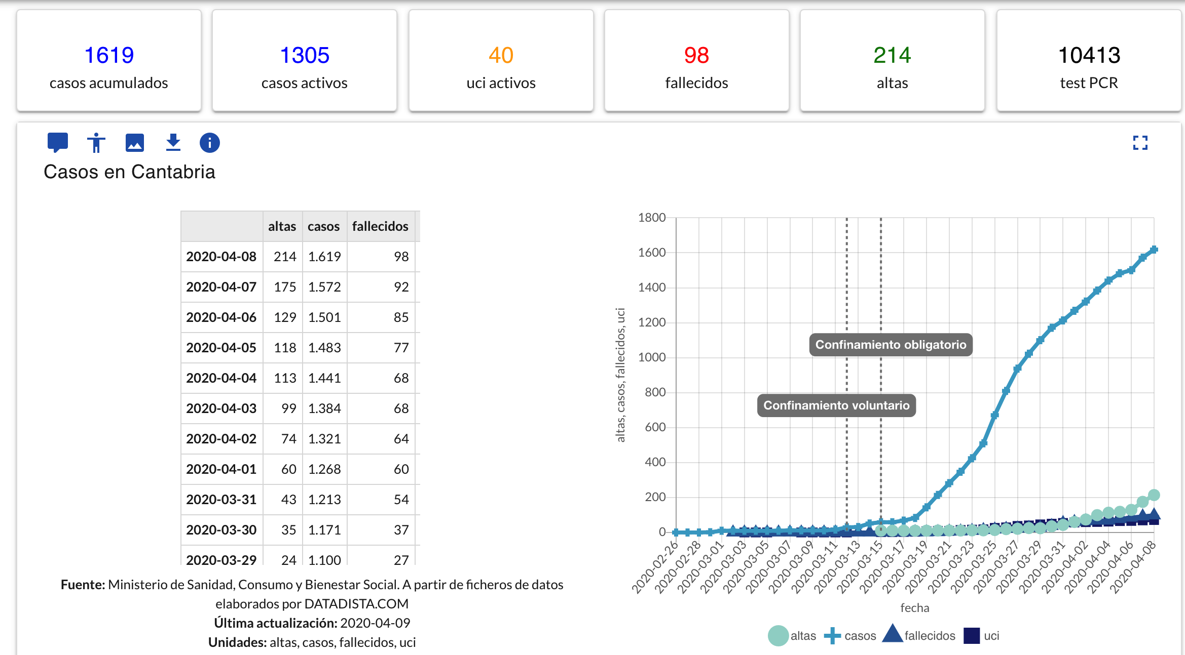 También hay acumulados un total de 370 casos confirmados de personas de residencias de mayores y 167 positivos por coronavirus en profesionales sanitarios. Hasta el momento, en Cantabria se han realizado 11.017 test PCR, en tasa, 1.895 test por cada 100.000 habitantes.