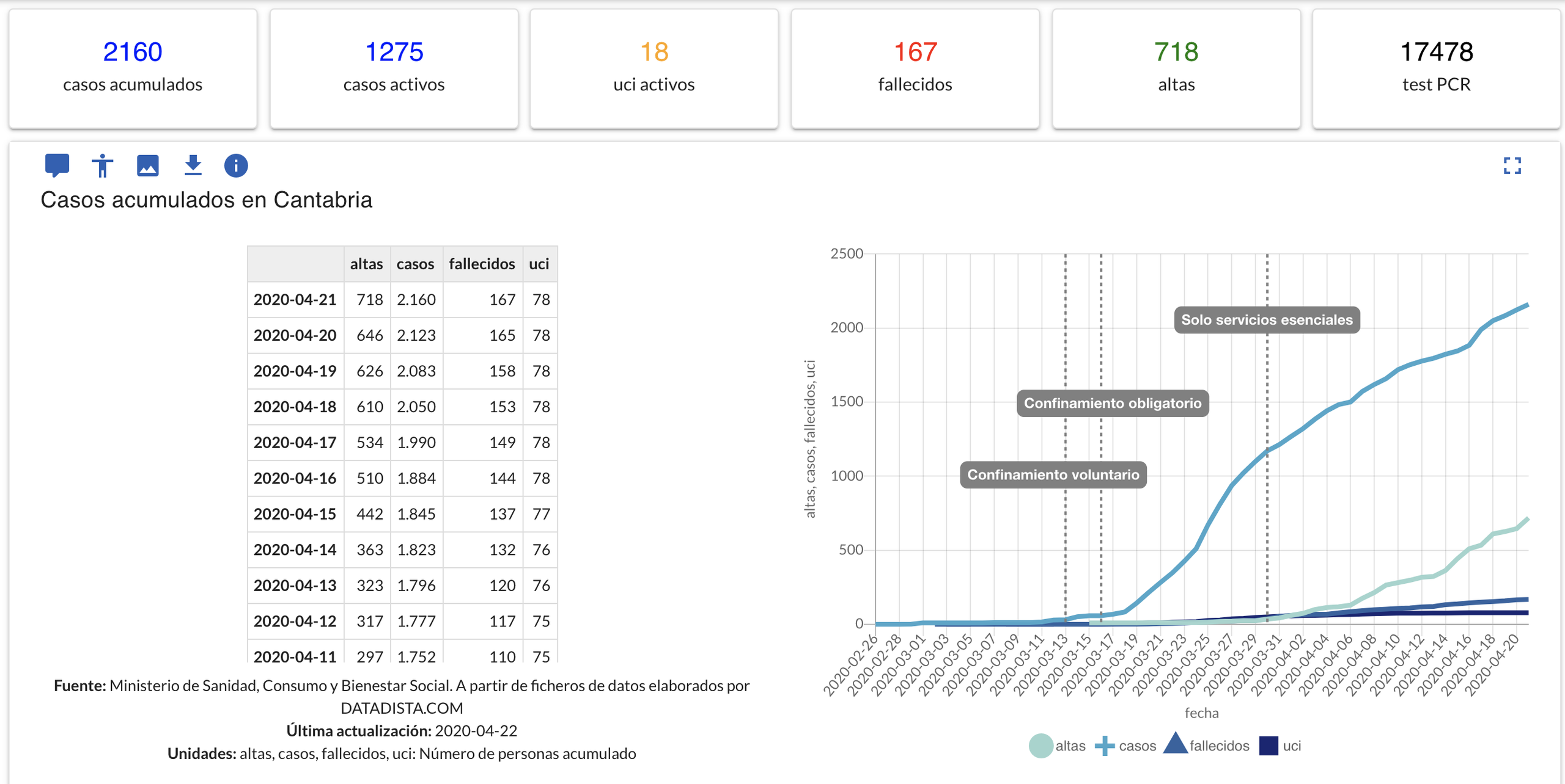 La tasa de crecimiento de casos diarios de coronavirus se sitúa por primera vez desde el inicio de la pandemia en el 1,53%, ya que la cifra acumulada de personas que han dado positivo en Cantabria es de 2.160 (2.012 detectados mediante la prueba PCR microbiológica y 148 a través de test serológicos).