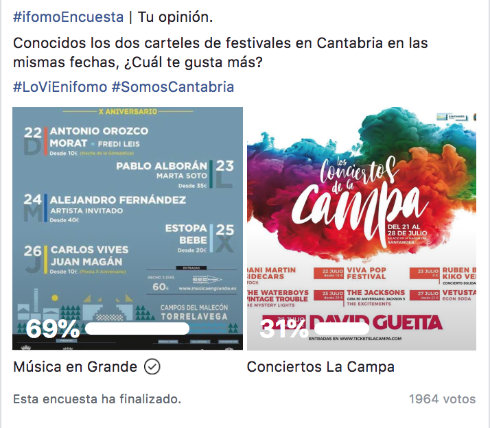 Los seguidores de ifomo han sido claros, sobre 1964 votos, 1355 internautas han elegido el Festival Música en Grande en Torrelavega, frente a 609 que han elegido el Festival Los Conciertos de La Campa de Santander.