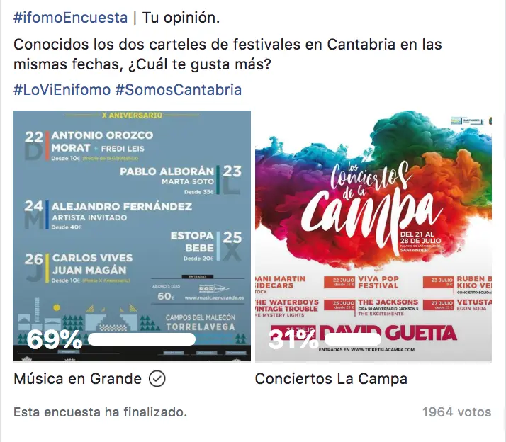 Los seguidores de ifomo han sido claros, sobre 1964 votos, 1355 internautas han elegido el Festival Música en Grande en Torrelavega, frente a 609 que han elegido el Festival Los Conciertos de La Campa de Santander.