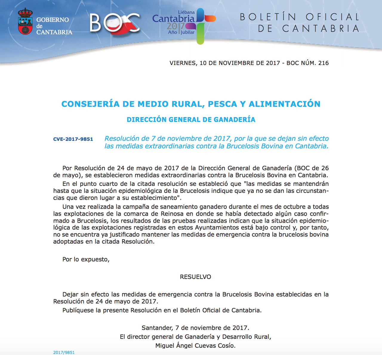 Por lo expuesto, RESUELVO Dejar sin efecto las medidas de emergencia contra la Brucelosis Bovina establecidas en la Resolución de 24 de mayo de 2017. Publíquese la presente Resolución en el Boletín Ofi cial de Cantabria."