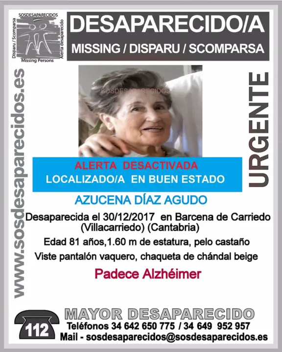 Sobre las 11 de la mañana efectivos desplazados por 112 Cantabria a Villacarriedo localizaban a Azucena en Saro de Enmedio junto al molino, minutos antes localizaba el paraguas que llevaba cuando salió de la Residencia de Mayores donde vive, solo presenta síntomas de hipotermia, su estado general es bueno.