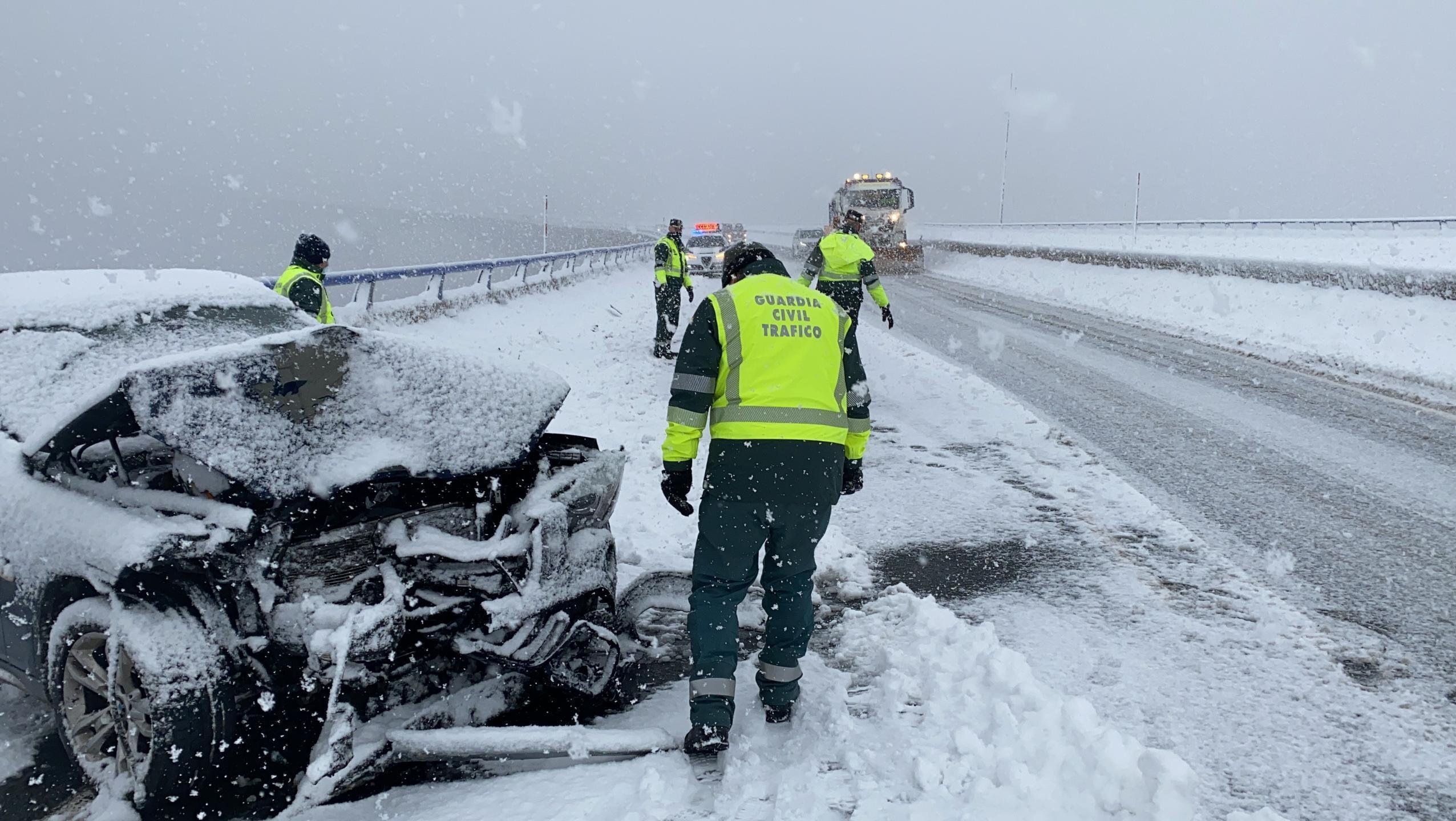 Agentes de la Agrupación de Tráfico de la Guardia Civil, pala en mano, han ayudado a los coches y furgonetas atrapadas a salir y continuar su marcha.