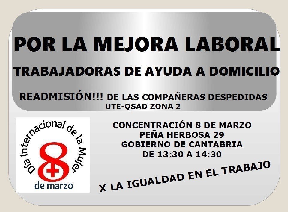 Auxiliares del servicio de ayuda a domicilio, que el Gobierno de Cantabria tiene contratado con varias empresas en función de la zona de la región, se concentrarán el próximo miércoles, 8 de marzo, frente a la sede del Ejecutivo, para denunciar la vulneración de sus derechos laborales y la precarización de un colectivo "especialmente infravalorado" pese a su "indispensable labor". La concentración del colectivo de auxiliares tendrá lugar de las 13.30 a las 14.30 horas, frente a la sede del Gobierno, donde esperan poder ser recibidas por los máximos responsables autonómicos para entregarles un documento con sus reivindicaciones, según ha informado este lunes el sindicato Trabajadores Unidos (TÚ) en un comunicado. Este sindicato ha señalado que esta concentración, que además tendrá lugar coincidiendo con la conmemoración del Día Internacional de la Mujer Trabajadora, es una de las actuaciones emprendidas por el colectivo de auxiliares del servicio de ayuda a domicilio después de que el pasado 20 febrero una de las empresas adjudicatarias, la UTE QSAD, despidiese a tres trabajadoras. Este colectivo reivindica que el servicio que presta "es la piedra angular del sistema de servicio sociales" y además "tiene rostro de mujer". "El 99% de las trabajadoras que atienden y cuidan a nuestros mayores y dependientes son mujeres y más el 70% de las usuarias que precisan este servicio también son mujeres. No es un dato baladí. Es el reflejo de una sociedad instalada aun en el heteropatriarcado y tiene sus consecuencias en el ámbito laboral", han denunciado. Pero, para estas trabajadoras, "lo más preocupante es que empresas financiadas con dinero público que gestionan los servicios de la ayuda a domicilio del Instituto Cántabro de Servicios Sociales (ICASS) vulneren los derechos de las trabajadoras precarizando la contratación de un colectivo especialmente infravalorado, pese a ser indispensable para mantener el bienestar de las personas en situación de especial vulnerabilidad". Han indicado que creen en "la responsabilidad del Ejecutivo para la adecuada financiación de estos servicios" y, por ello, exigen tanto al Gobierno como al Parlamento de Cantabria que estén "vigilantes" y realicen "un seguimiento y protección de los derechos laborales del personal" que presta servicio como el de ayuda a domicilio. Además, piden al Gobierno de Cantabria que mantenga una reunión con las empresas contratadas para el servicio de ayuda a domicilio y los representantes de las trabajadoras para exigir, entre otras cosas, la readmisión de las auxiliares despedidas, un calendario laboral según convenio para todas las trabajadores, el abono del kilometraje por desplazamientos, la dotación de medios técnicos y el "cese de las reducciones de salario y jornada, así como las contrataciones en precario".
