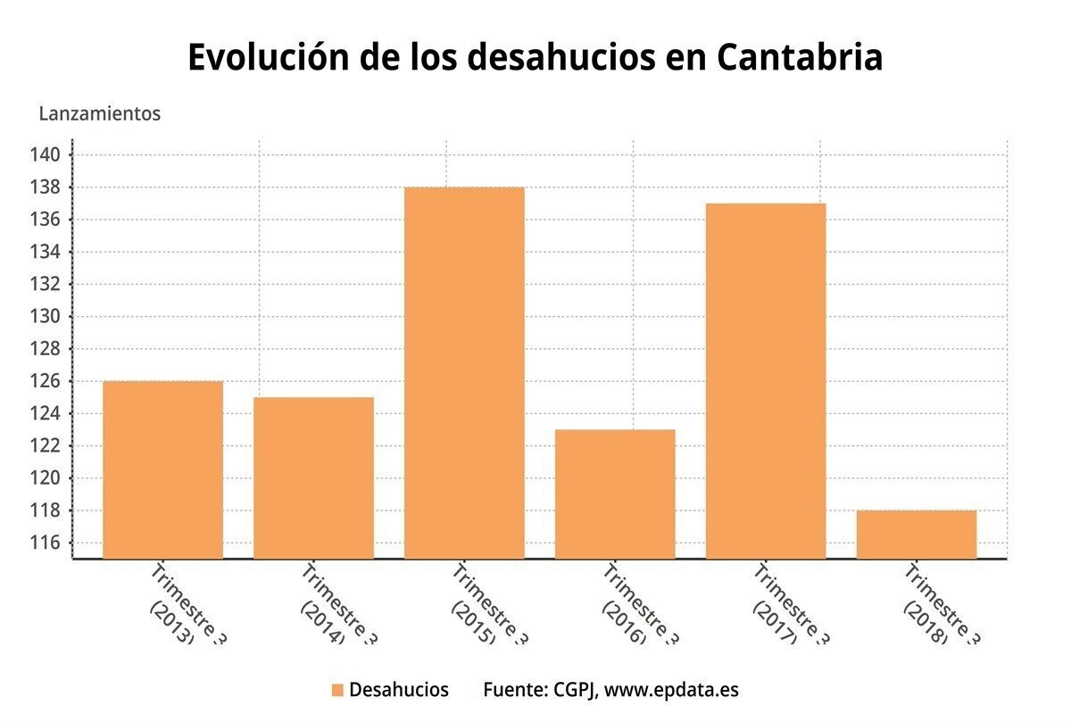 Los juzgados de Cantabria practicaron durante el tercer trimestre del año 118 lanzamientos, un 13,9 por ciento menos que en el mismo periodo de 2017. El descenso es más acusado en los que responden a ejecuciones hipotecarias, que bajaron de julio a septiembre un 34,4 por ciento respecto al tercer trimestre del año anterior.