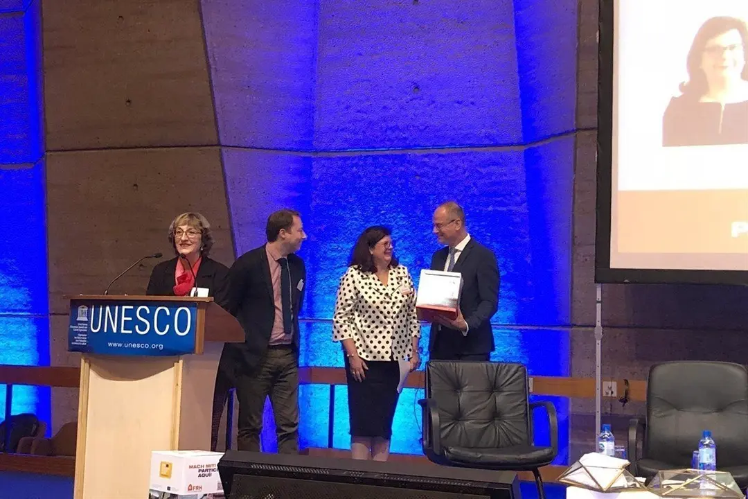 En el acto de apertura de esta Bienal, que se celebró este jueves en la sede de la UNESCO, la directora general de Cultura, Eva Ranea, hizo entrega al comisario europeo de Cultura, Educación, Juventud y Deporte Tibor Navracsics, de la Antorcha del Patrimonio y la Cultura que estaba en el Centro de Estudios Lebaniegos en Potes.