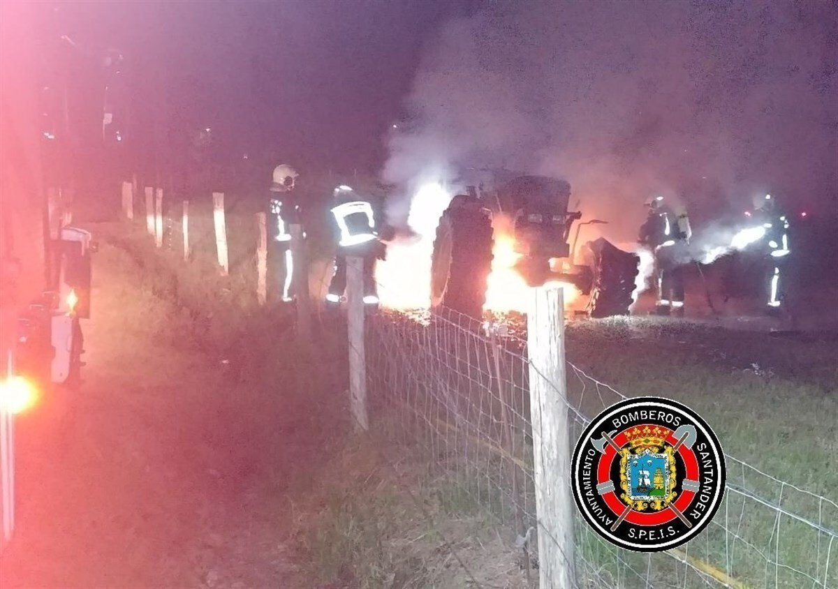 Una dotación de bomberos de Santander, alertada por el 112 Cantabria, acudió de madrugada a sofocar un incendio registrado en un tractor en una finca próxima a la carretera autonómica CA-146, que comunica la salida de la Autovía del Cantábrico A-8 con Galizano.