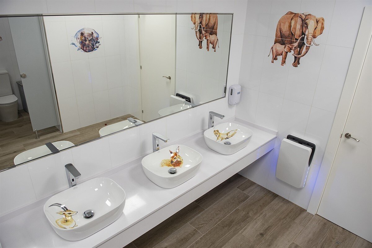 "El trabajo comienza con las huellas pintadas sobre algunas de las baldosas que revisten el suelo, conduciéndonos hasta todos los lavabos exentos y los azulejos de las paredes. Allá donde dirijamos la mirada encontraremos representados leones, bisontes, antílopes, jirafas o gorilas entre otros muchos animales que nos observan, haciéndonos sentir en un espacio único y sobre todo vivo", comenta una de las artistas que ha participado en el proyecto.