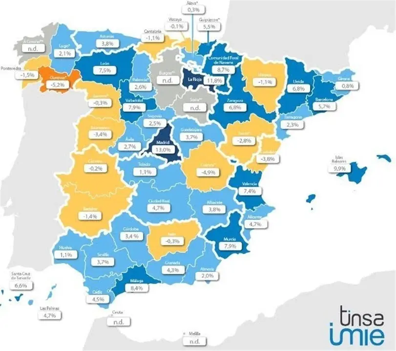 También destacan los incrementos interanuales de Murcia, Canarias, Cataluña y Andalucía, con subidas del 7,9%, 5,5%, 5,3% y del 5,1%, respectivamente. Por debajo del 5%, se encuentran Aragón (+4,8%), Comunidad Valenciana (+4,6%), Asturias (+3,8%), Castilla y León (+2,2%), Castilla-La Mancha (+2,4%) y País Vasco (+1,6%).
