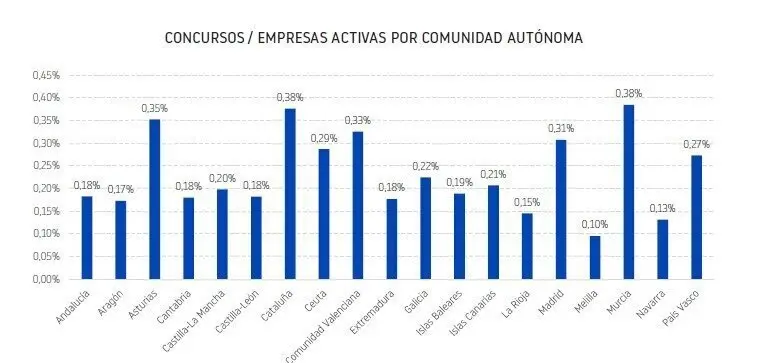 Atendiendo al comportamiento en las diferentes comunidades, la mayor tasa de concursabilidad se localiza en Cataluña y Murcia, con el 0,38% de las empresas activas, aunque la primera es también la comunidad que más procedimientos concursales acumuló en 2024 y mantiene un alto número de empresas activas. Las siguientes son Asturias, con un 0,35%, Valencia, con 0,33% y Madrid, con 0,31%. En el lado opuesto, Melilla, Navarra y La Rioja tienen las tasas más bajas.