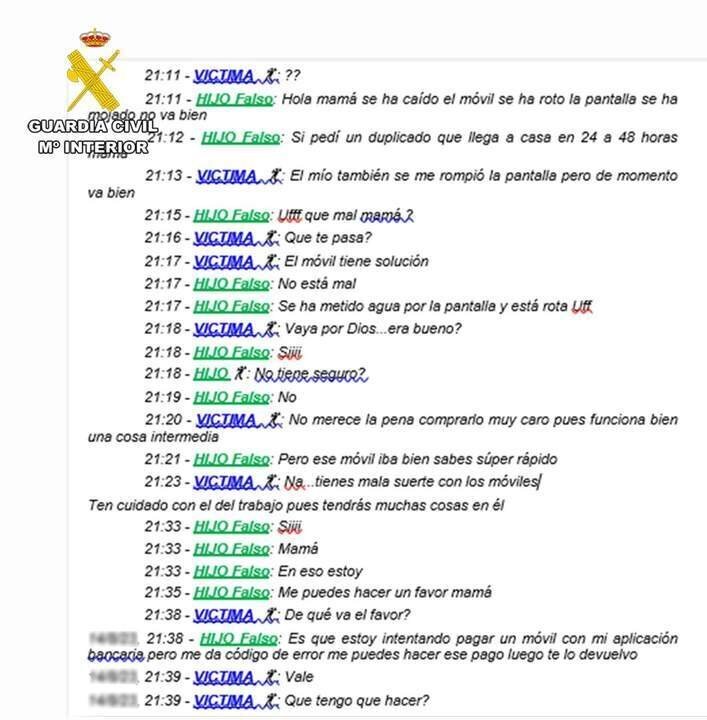 Ganada la confianza, el ciberdelincuente expuso problemas graves de familia y económicos que debía resolver con urgencia, comenzando así las víctimas a realizar transferencias para ayudar al que creían su hijo, hasta que se dieron cuenta de que era una estafa. El dinero se transfirió a seis cuentas diferentes.