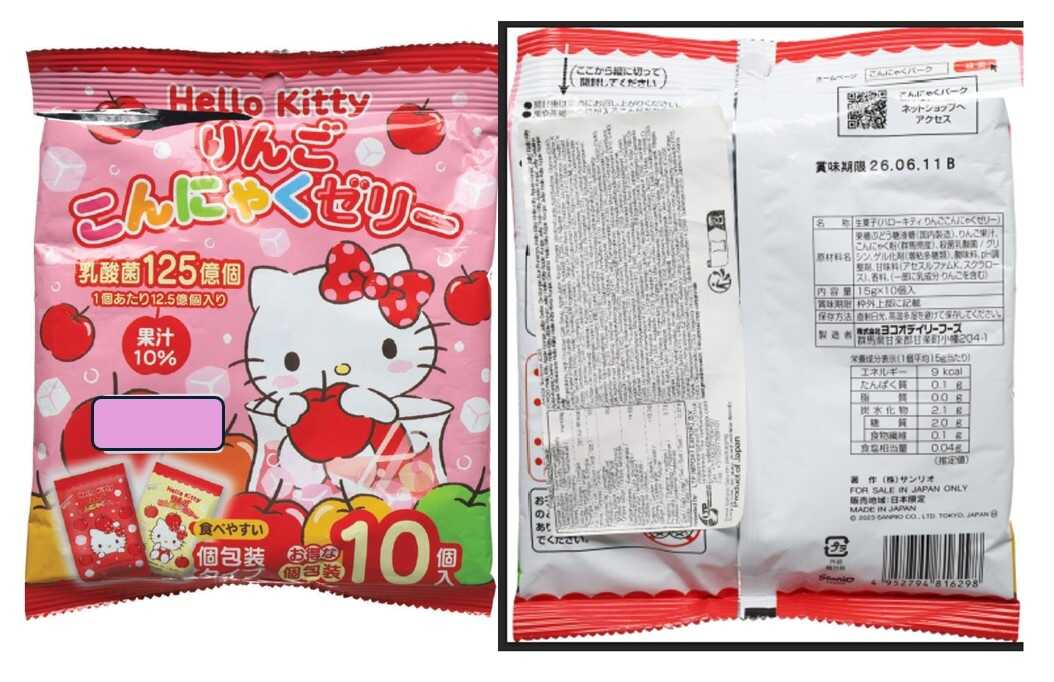 El producto se comercializa bajo el nombre 'Gelatina Hello Kitty de manzana y konjak', de la marca Sanrio, procedente de Japón. El formato es de bolsa de plástico que contiene sobres individuales.