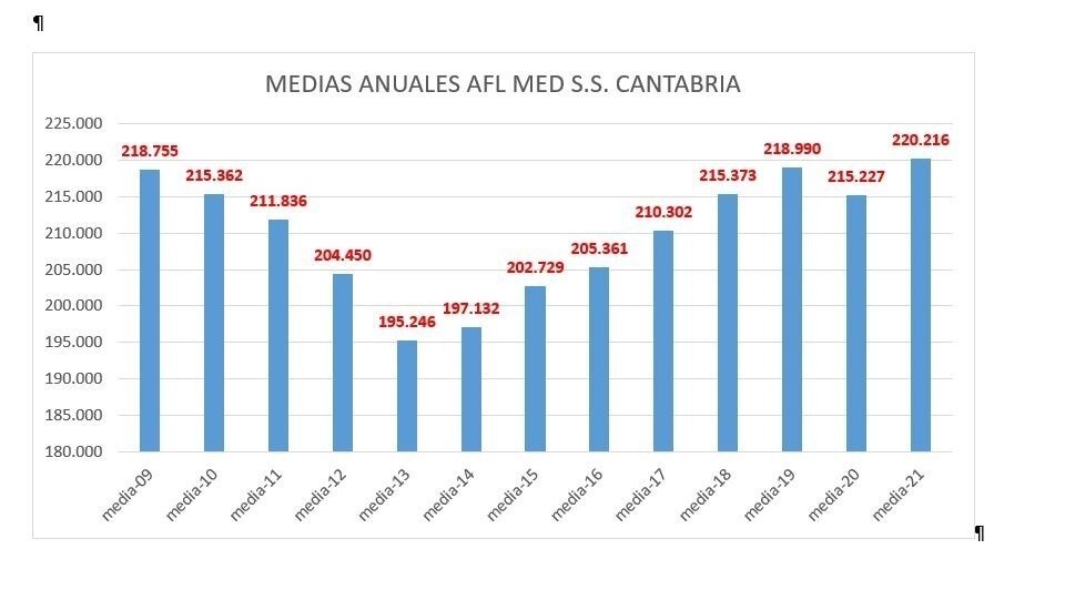 Cantabria ha registrado en 2021 el mejor dato de afiliación a la Seguridad Social de los últimos 14 años, con una media anual que supera las 220.000 personas afiliadas.