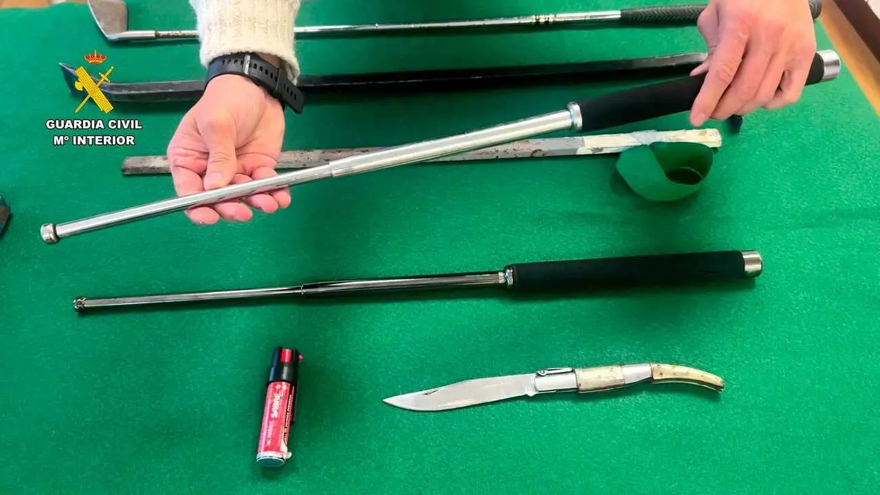 Sin embargo, en el registro de los vehículos se hallaron diversos objetos: en el maletero de uno de ellos se localizaron un hacha, una pata de cabra y un palo de golf; entre los asientos delanteros, dos defensas extensibles, y en una de las puertas, dos placas de hachís con un peso total de 100 gramos, lo que motivó la investigación del responsable de la droga.