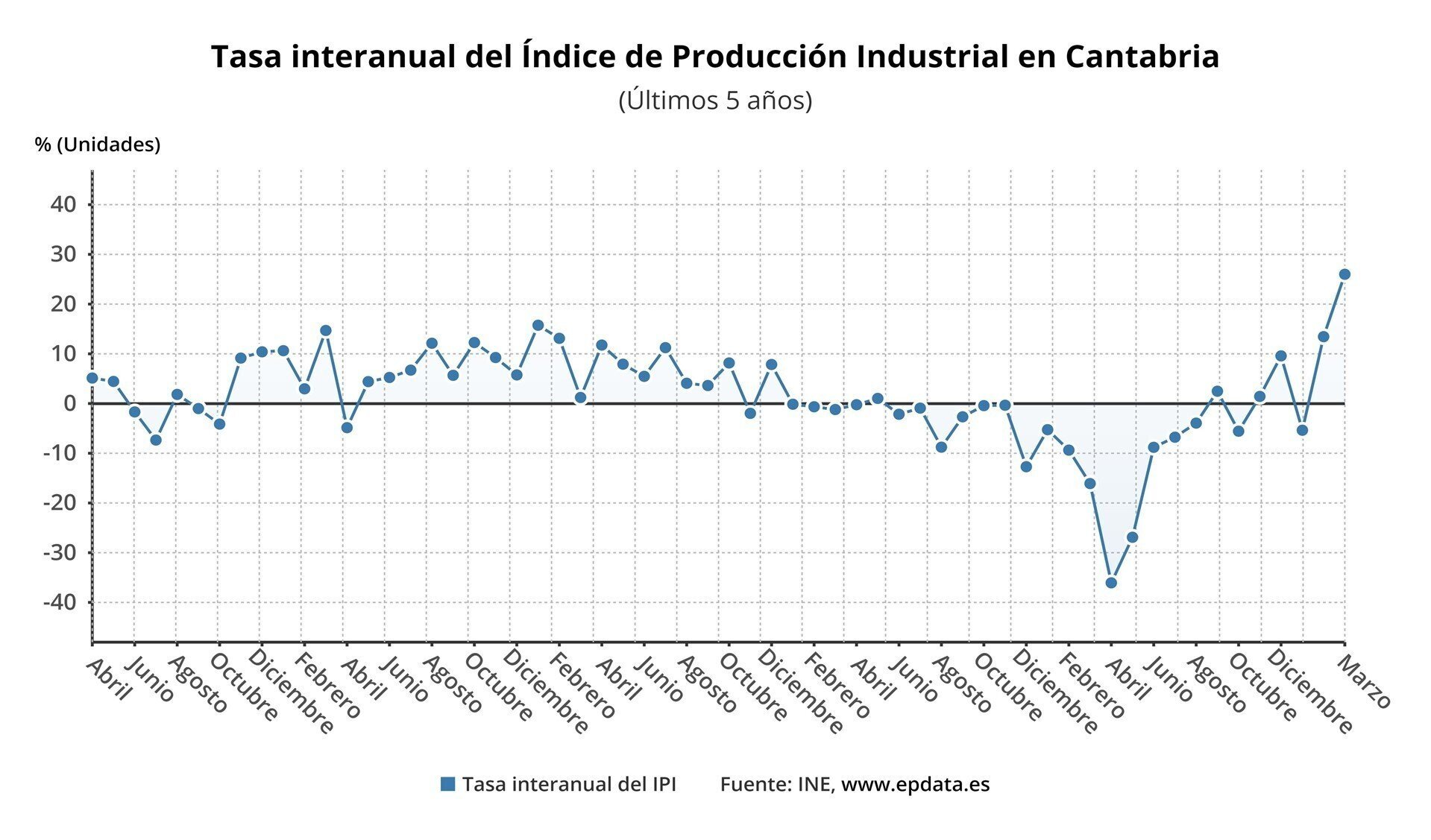 La producción industrial creció en marzo en Cantabria un 26 por ciento, el mayor incremento por comunidades tras el de Navarra (31,2%), según ha informado este viernes el Instituto Nacional de Estadística (INE).