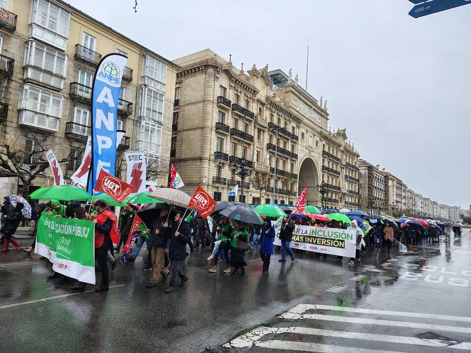 Un millar de docentes de Cantabria --según los convocantes-- ha desafiado este mediodía a la lluvia y se ha manifestado por las principales calles de Santander en defensa de la educación pública y para solicitar otras reivindicaciones "pendientes" que siguen "sin ser atendidas", tras la firma del preacuerdo el pasado jueves entre la Consejería de Educación (PP) y la Junta de Personal Docente (STEC, ANPE, CCOO y UGT) para hacer efectiva la adecuación salarial del profesorado.