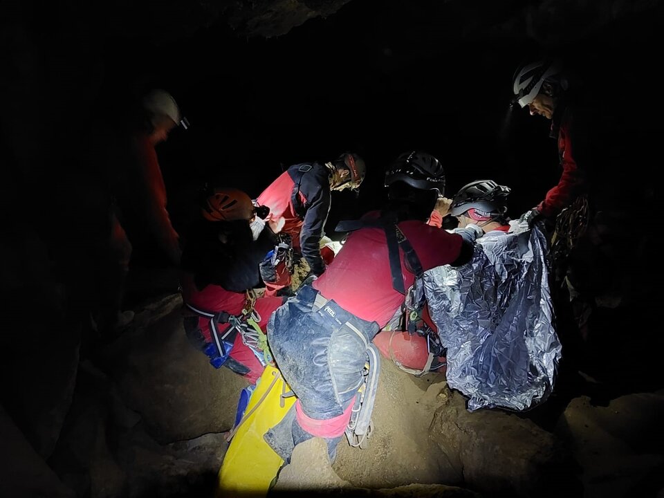 El médico rescatador que accedió a la cueva con dos espeleólogos en busca del herido, que estaba localizado a unos 30 minutos de un acceso de la cavidad, le ha reducido la luxación y colocado el hombro, además de administrarle analgesia con antiinflamatorio.
