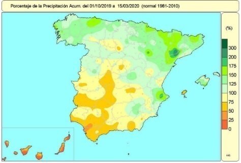 El año hidrológico comenzó el 1 de octubre de 2019 con una escasez de precipitaciones acumulada del 19 por ciento inferior al valor normal en octubre, pero noviembre y los siguientes meses han contribuido a que hasta mediados del mes de marzo, casi la mitad del ejercicio hídrico 2019-2020, las lluvias superan en un 9 por ciento el valor normal, según la Agencia Estatal de Meteorología (AEMET).