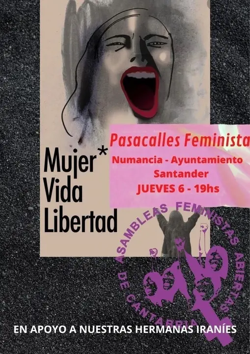 Las Asambleas Abiertas Feministas de Cantabria llaman a "solidaridarse con las valientes mujeres iraníes que, al grito 'Mujeres, vida y libertad', desde el 16 de septiembre, en el que Jina (Mahsa) Amini muriera tras los golpes y torturas de la policía de la moral iraní por no llevar bien puesto su hijab, están desafiando el régimen teocrático irani".