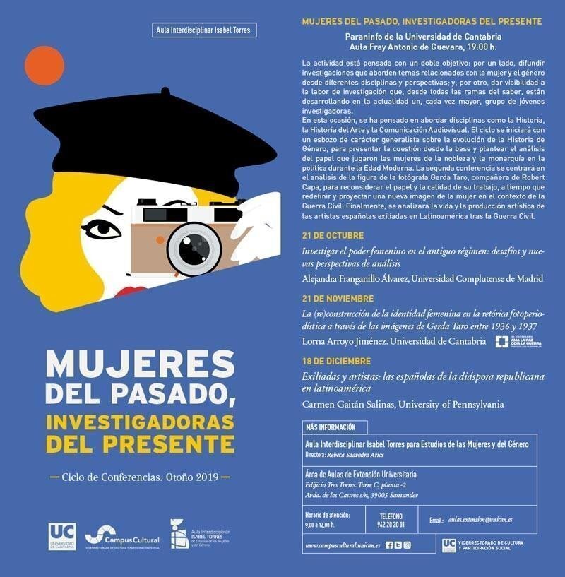 Según ha informado la UC, el ciclo, de entrada libre y gratuita, proseguirá el jueves 21 de noviembre con Lorna Arroyo, profesora del Departamento de Educación de la UC, con el tema 'La (re)construcción de la identidad femenina en la retórica fotoperiodística a través de las imágenes de Gerda Taro entre 1936 y 1937'. El análisis de la figura de esta fotógrafa que fue compañera de Robert Capa permitirá reconsiderar el papel y la calidad de su trabajo, proyectando una nueva imagen de la mujer en el contexto de la Guerra Civil.