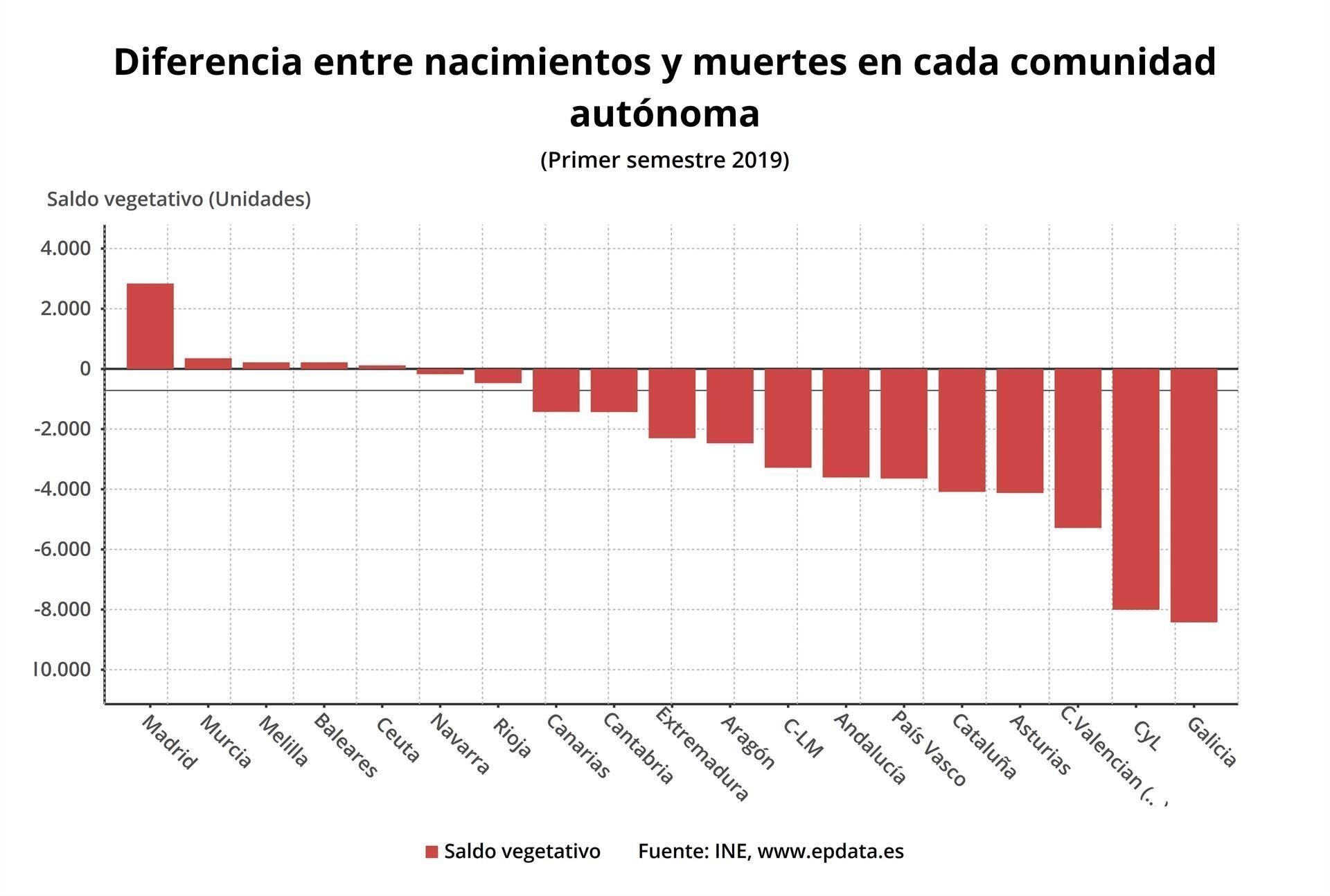 Con todo, se trata del cuarto saldo vegetativo negativo menor de las comunidades tras Navarra (-176) y La Rioja (-471) y Canarias (-1.429). Solo tres comunidades presentaron saldo positivo: Madrid (2.840), Región de Murcia (354) y Baleares (219), así como las ciudades autónomas de Melilla (219) y Ceuta (119).