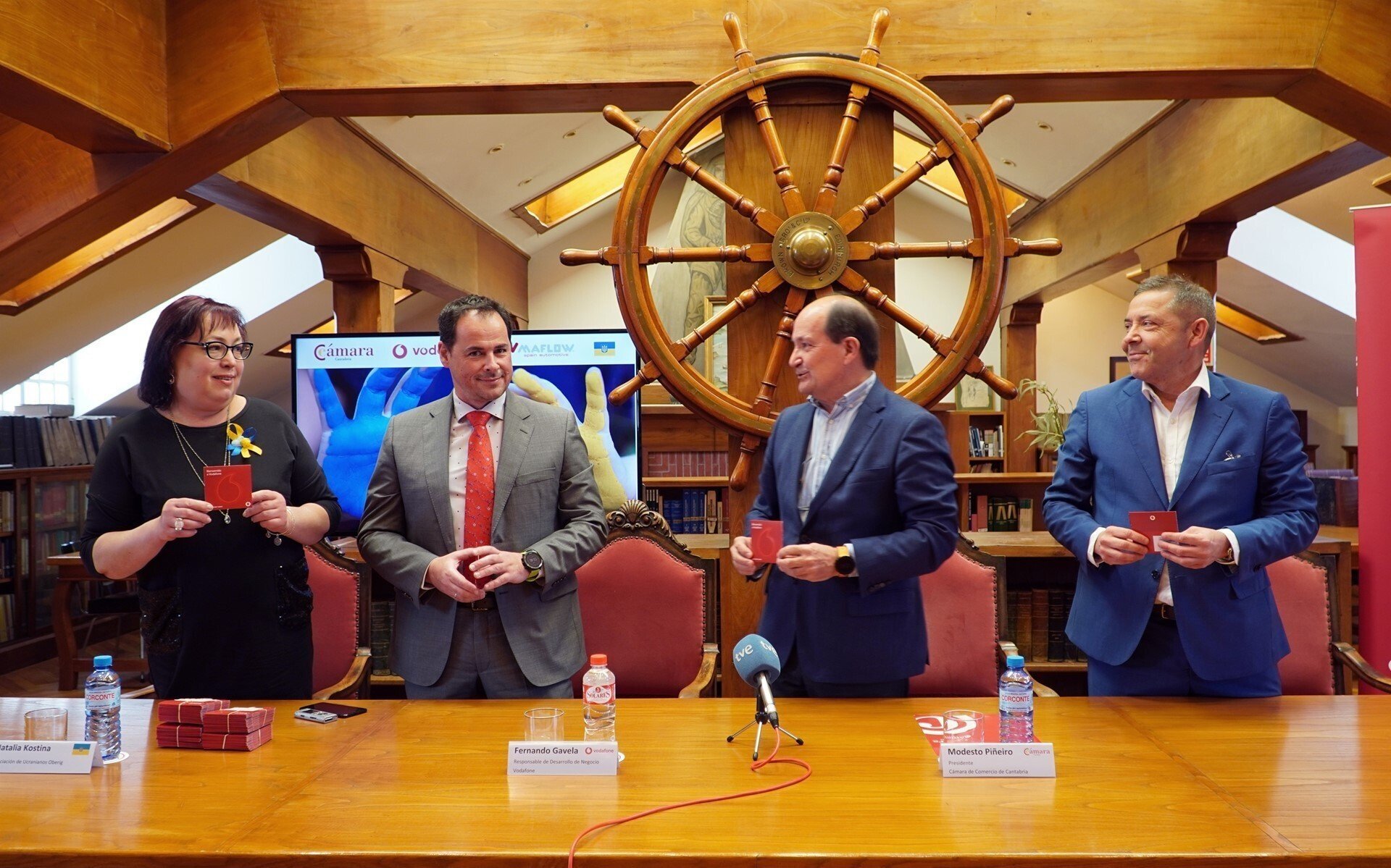 El presidente de la Cámara, Modesto Piñeiro, ha entregado este lunes 70 de las 300 tarjetas a la representante de la asociación de ucranianos Oberig, Natalia Kostina, en un acto en el que también han estado el representante de Vodafone Fernando Gavela, y el director general de Maflow Spain Automotive, Marcos Díaz.