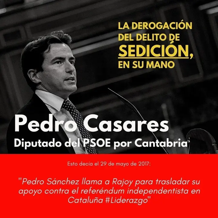 En Cantabria, el PP se dirige al diputado nacional del PSC-PSOE, Pedro Casares, y señala que, en mayo de 2017, Pedró Sánchez llamó a Mariano Rajoy para trasladarle su apoyo en contra del referéndum independentista en Cataluña. Asimismo, alude a cuando dijo, en abril de 2019, que el artículo 155 de la CE se aplicó para recuperar la legalidad en Cataluña tras una declaración unilateral de independencia ilegal.