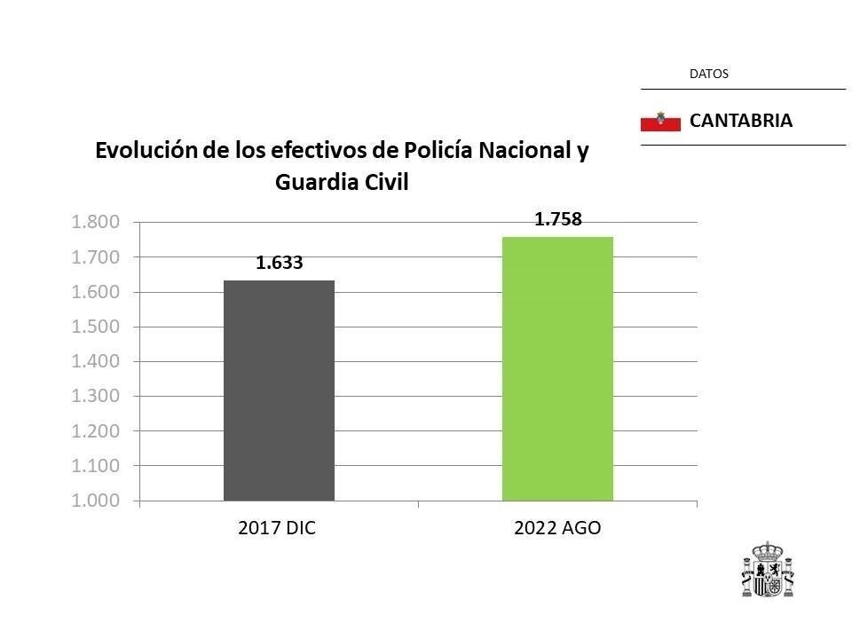 Cantabria ha alcanzado los 1.758 efectivos de Policía Nacional y Guardia Civil, la mayor cifra de los últimos diez años, gracias al aumento del 7,7 por ciento de las plantillas impulsado por el Ministerio del Interior en los últimos cuatro años.
