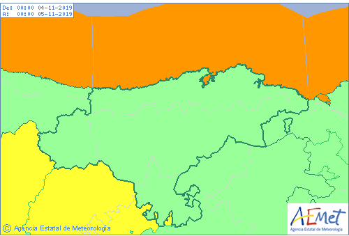 Por fuerte oleaje estarán en riesgo: Almería, Granada, Girona, Melilla, Castellón, Valencia, Pontevedra (también en aviso amarillo por lluvias), Ibiza y Formentera, Mallorca y Menorca; mientras que se ha decretado alerta naranja por riesgo importante en: Cantabria, A Coruña, Lugo, Vizcaya, Guipúzcoa y Asturias.