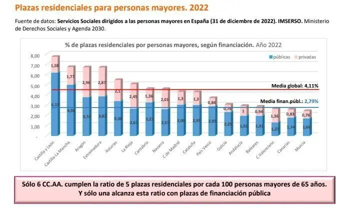 Las comunidades autónomas con mayor déficit de plazas siguen siendo Andalucía y la Comunidad Valenciana, con 32.670 y 24.843 respectivamente. Mientras que en seis comunidades sigue habiendo un exceso de plazas, destacando Castilla y León, con 17.234. Navarra, Cantabria y La Rioja son las comunidades con mayor equilibrio en su ratio de plazas por personas mayores de 65 años.