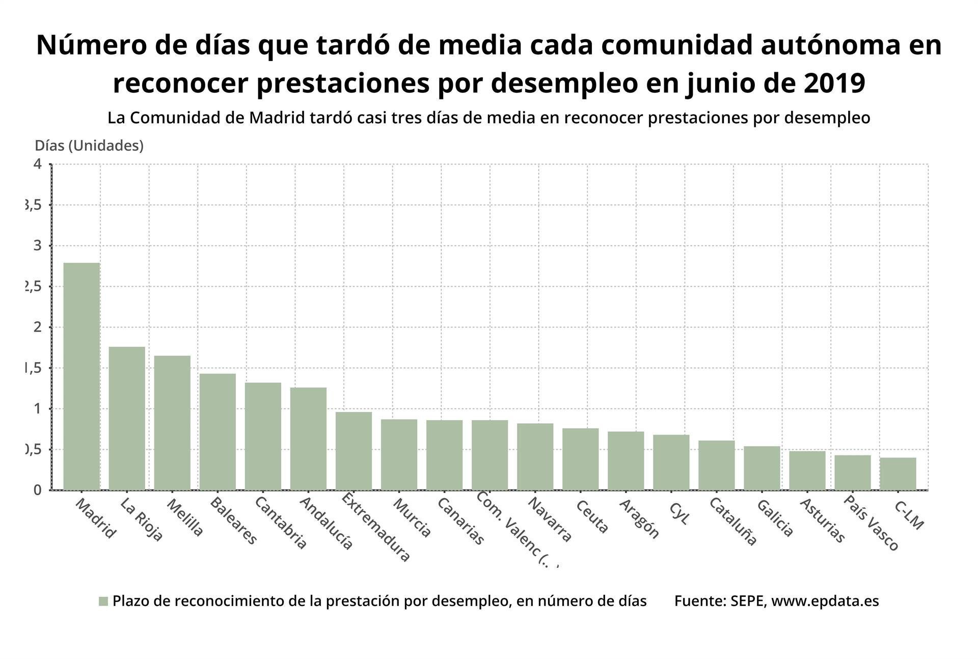 Les siguen Baleares (1,43 días), --Cantabria (1,32 días)-- y Andalucía (1,26 días). Todas estas regiones, más Melilla (1,65 días), superan el plazo medio nacional de reconocimiento de prestaciones por desempleo, que en junio alcanzó 1,08 días.
