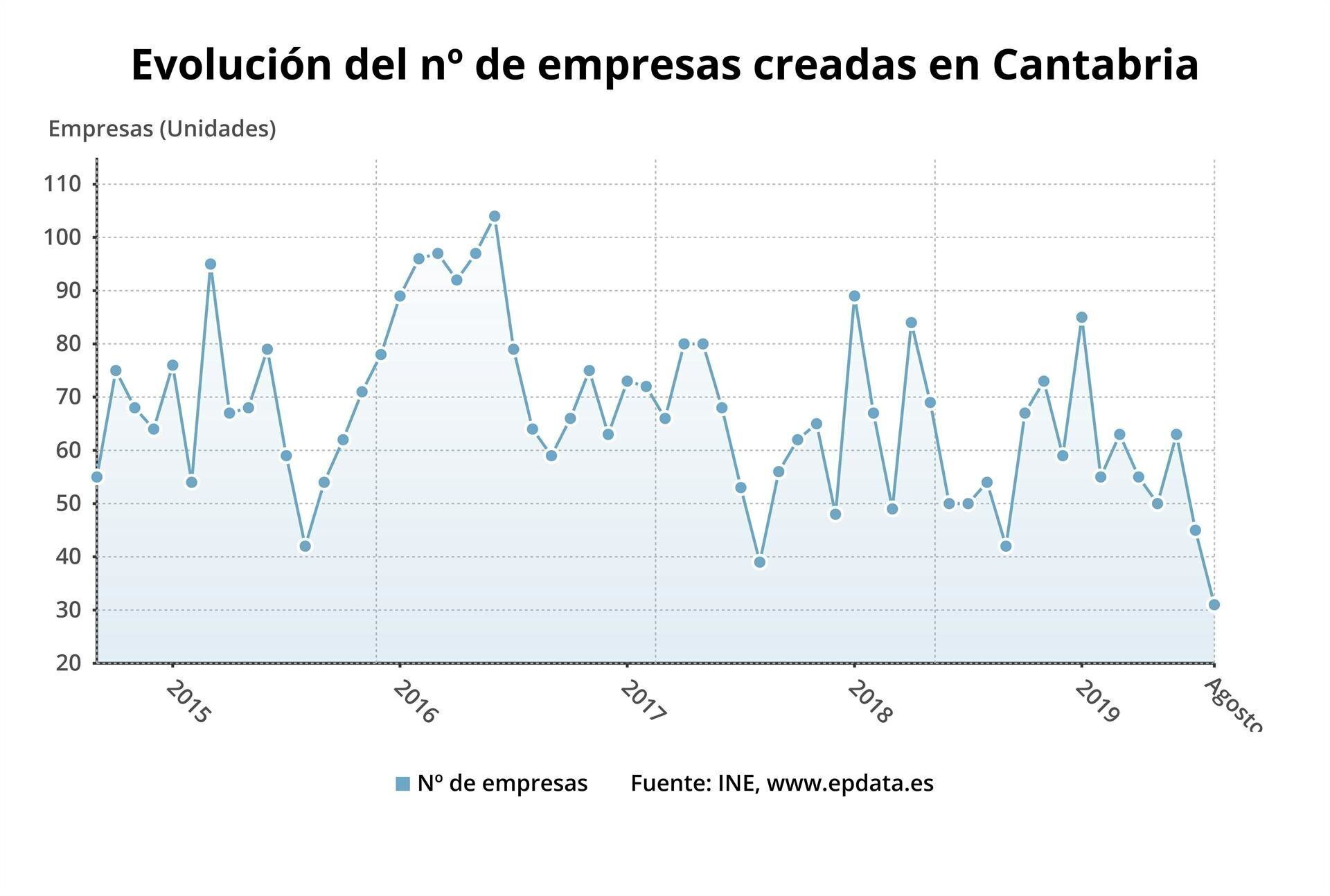 La creación de nuevas empresas cayó un -42,6% en agosto en Cantabria respecto al mismo mes del año anterior, con un total de 31 entidades, lo que supone el mayor retroceso de todas las comunidades autónomas, donde la bajada media fue del -8,6%.