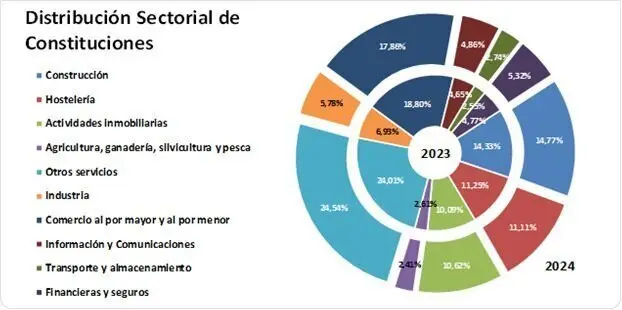 En cuanto a la composición sectorial de las nuevas empresas, el informe destaca que la tendencia en 2024 se mantuvo estable en comparación con periodos anteriores. De esta forma, el 42,4% de las nuevas constituciones se distribuyen entre el comercio y otros servicios (no financieros, inmobiliarios o de comunicaciones), mientras que la hostelería representa el 11,1%.