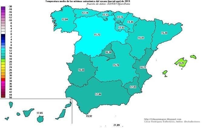 A continuación se sitúan Castilla-La Mancha, con 15,78 grados; Madrid (16,30), Extremadura (16,60), Comunidad Valenciana (16,77), Andalucía (17,06), Canarias (17,65) y Murcia que con 17,83 grados registró la mínima más alta de la Península.