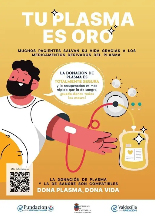Por ello, el Banco de Sangre y Tejidos de Cantabria (BSTC), unidad adscrita a la Fundación Marqués de Valdecilla, ha puesto en marcha la campaña 'Tu plasma es Oro', con la que quiere concienciar a la población e informar acerca de este tipo de donación, que es menos conocida que la de sangre, pero presenta algunas peculiaridades como la posibilidad de donar mucho más a menudo gracias a que el tiempo de recuperación es menor.